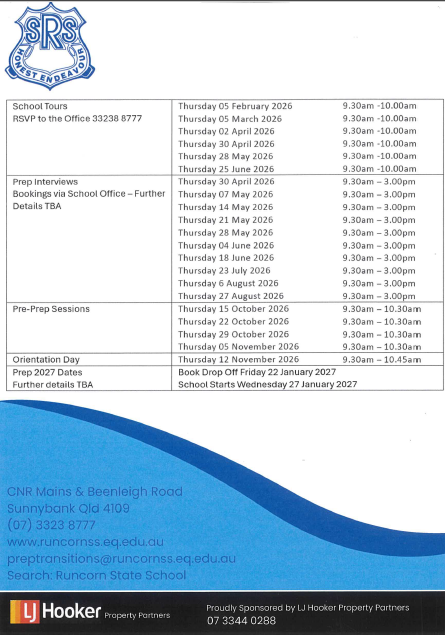 We are now accepting Prep 2027 Enrolments. Please email through your Expression of Interest (your name, contact details, address and name of child you are enrolling) to preptransitions@runcornss.eq.edu.au for Prep 2027. For more information about Prep 2027 enrolment and to receive an enrolment pack which includes Student Enrolment Form, Prep Questionnaire, Media Consent Form, Schoolzine Consent Form, Uniform Policy and RSS Prep Parent Handbook, please contact the school on (07) 3323 8777. Alternatively, they can be downloaded here by clicking on the links above.